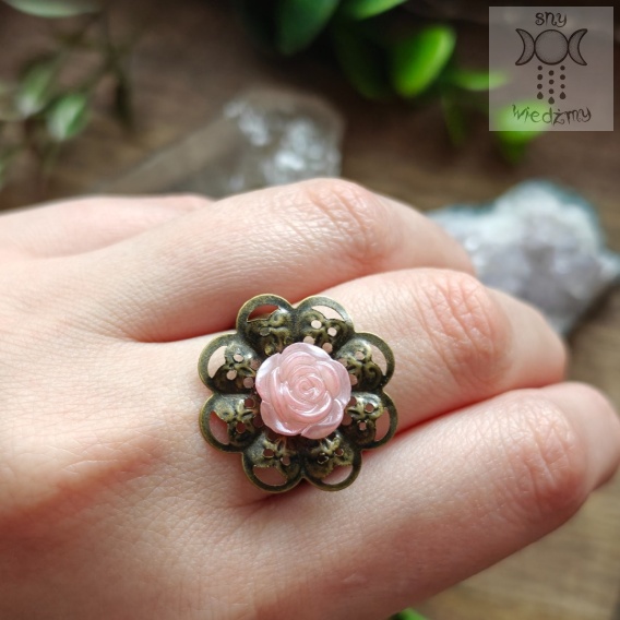 Pierścionek Filigranowa Róża różowa brąz ażurowy regulowany